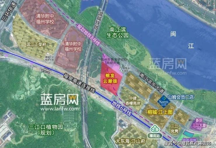配套方面,周边分布有南江滨生态公园、三江口植物园(规划)等休闲配套,北侧为科研用地(福州市教育研究院新址),西北侧为十二年一贯制清华附中福州学校,东侧还有大型商业商务综合体嘉里中心(榕城江上图),并引进福州山姆会员店二店。