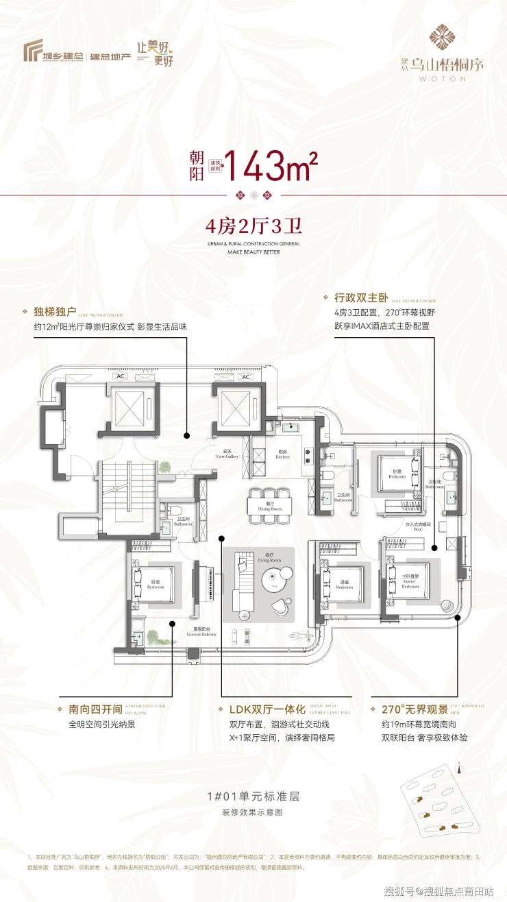 这是项目中最受瞩目的明星户型。约19米的南向超大面宽,让整个白天室内都充满阳光。关键升级在于“三卫”配置,尤其是“双主卧”概念的引入——通常除了自带独立卫生间的主人套房外,还会有一个次卧套房也配备独立卫生间,极大解决了多代共居时早高峰的卫生难题,也给予长辈或客人极高的尊重与便利。270°的转角飘窗,将视野从二维扩展到三维,无论是观景还是室内空间的延伸感,都得到质的飞跃。此户型完美支撑了有二胎、需老人同住或经常有亲友留宿的大家庭的高品质生活。