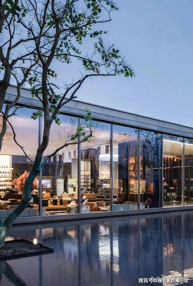 院落之内,围绕着中心“湖面”,组织了三栋建筑,纯净的水岸玻璃展厅,以及两栋住宅样板间。