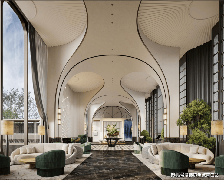 触手凤翎纹绿奢石镶嵌的门把手,一座约7米挑高的文冠穹顶大堂,铺展开了归家的尊贵序幕。