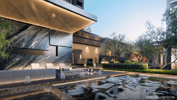 在中庭潮汐水院通过巧妙的布局和景观设计,让业主在水院之中仿佛置身艺术馆,远眺、近观皆是风景。创新性地引入“潮汐”概念,夏季涨潮,水面扩展为镜池,可以更好展现莫奈《睡莲》中的风景;冬季退潮,露出汀步与平台,便是邻里间互动社交空间。