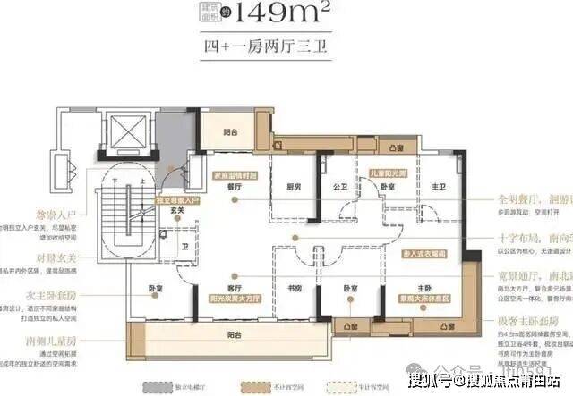 建面约149平米的产品,最多可以做到五房三卫,当然,非要做五房的话,邻近客厅的书房空间很小。