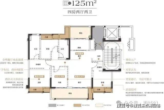 建面约125平米的户型,为四房两厅两卫,南向四开间,其中三房朝南一房朝北;