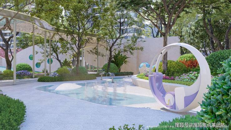 双轴五进东方府园设计:13栋高层围合布局,打造中央超大中庭园林(约2万㎡),绿化率达40%,融入儿童乐园、健身步道等全龄化设施。