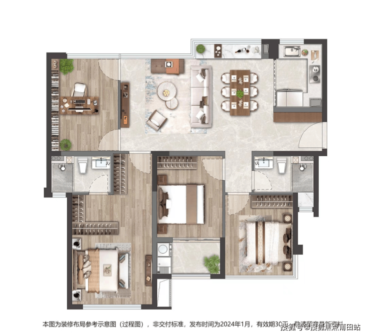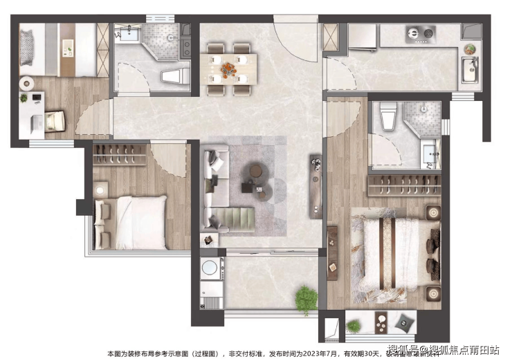 82㎡三房两卫:三卧朝南,主卧独立明卫+观景飘窗,动线科学。