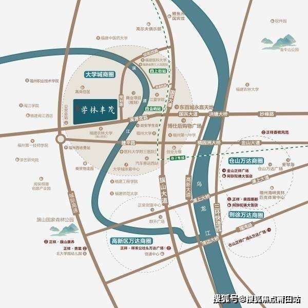 [便捷交通路网]西临福银高速(四环),南临宫源溪路,临近大学城公交站点,便利接驳地铁2号线金屿站,途经洪塘大桥(扩建中)畅达鼓楼;沿建平路由橘园洲大桥即达金山,畅达全城。