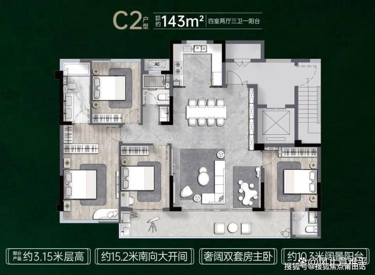②高层高:多数为3米以上层高,143㎡以上产品做到3.15米;部分125㎡产品也有3.15米层高