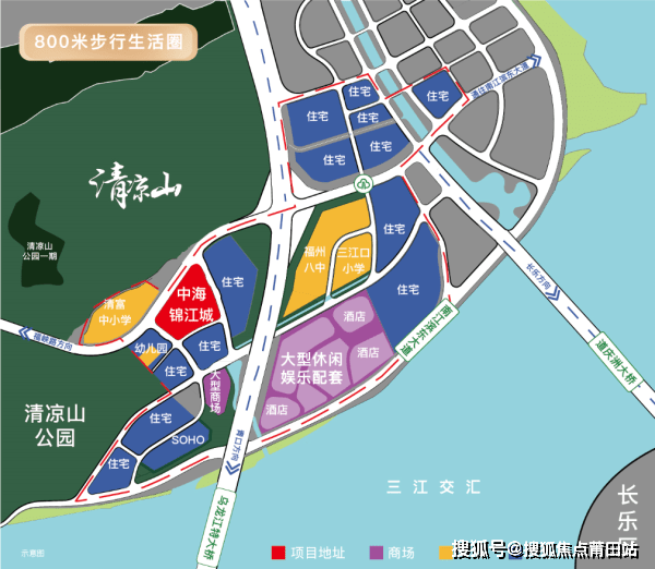 【千亿公建】① 清富片区-纯粹居住/配套:三江口千亩文化旅游城(建设中,总投资38.5亿、占地400余亩,包括冰雪乐园等五大主题乐园,其中福州眼摩天轮已亮灯);② 下洋片区-总部基地/金融:国际金融中心(规划中,亚升集团、永辉集团意向建设总部大楼、绿地规划地标大厦);③ 梁厝片区-文化/旅游/生态:梁厝特色历史文化街区(建设中,三江口版三坊七巷、预计年底完成);约15万㎡海峡文化艺术中心(已建成,被誉为福州版的悉尼歌剧院);④ 樟岚片区-教育/体育/商务/办公:约34.4万㎡樟岚企业总部基地(建设中,在榕开发香格里拉大酒店项目)。
