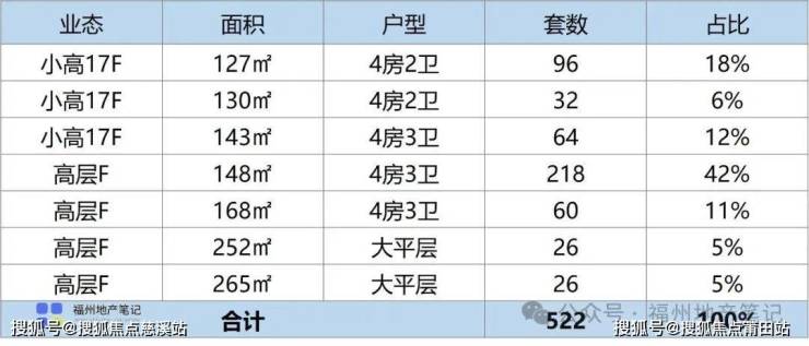 127-130㎡户型128套,143-148㎡280套,168㎡户型60套,252-265㎡户型52套。