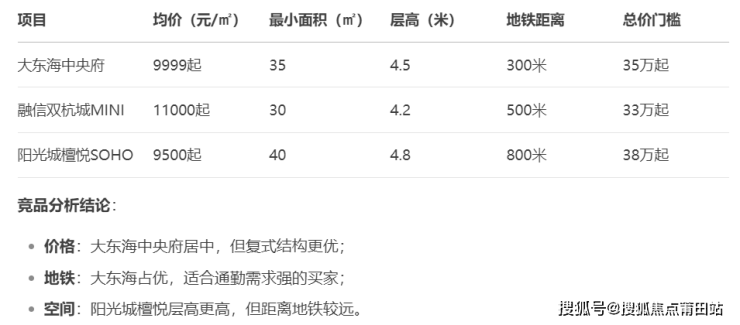 对比周边同类型产品,大东海中央府的优势在于地铁口+复式结构,但竞品如融信双杭城MINI、阳光城檀悦SOHO也有类似产品。 六、总结:适合谁买?