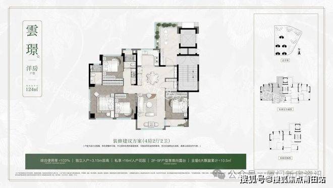 高层部分95平做三房,103平,116平做四房,86-89%超高得房率。洋房124平四房,更是1梯2户,带空中入户花园,2-5层更带南向阳光露台,综合使用率101~108%。