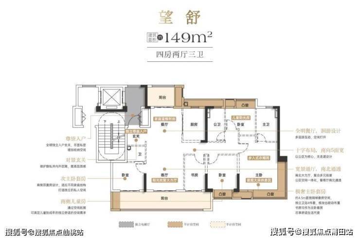 洋房产品主打125-149平方米的大平层,遵循大面宽、短进深的设计理念。例如125平方米户型可做到南向四开间,三房朝南一房朝北,餐客厅南北通透。149平方米户型则做出了市面上近170平方米的感受,做到4房+1房,3卫配置以及少承重墙的布局,使后期改造非常便利。
