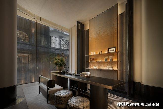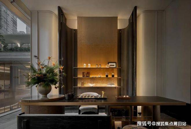 茶室以金属编织刺绣背景墙为亮点,将东方美学具象呈现。在喧嚣的都市找寻一处宁静空间,感受一盏时光的静谧,以木饰面构筑出对称式的东方美学,让宾客在品茶时,感受到品茗的仪式感。