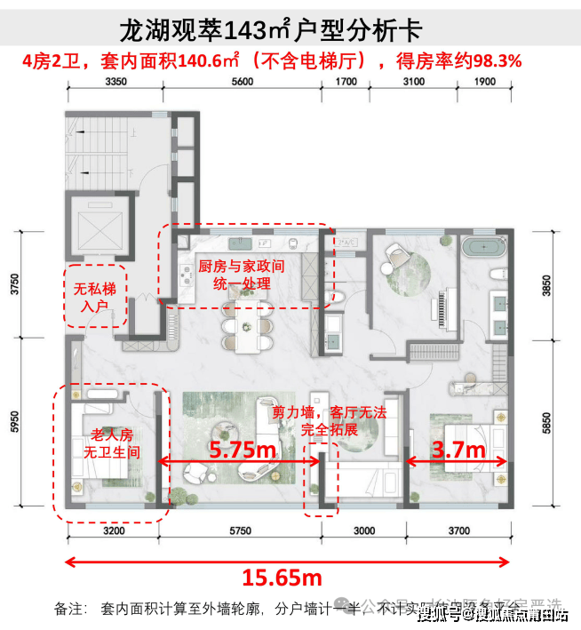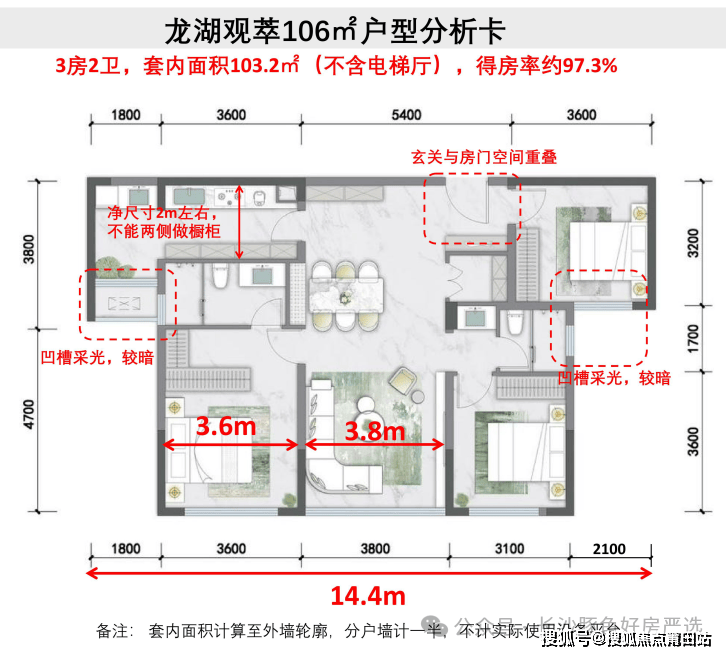 1. 上个时代的塔楼中间户,北侧没有窗户,虽然给了14.4m的面宽,但是各方面尺度跟现在新规户型有差距;