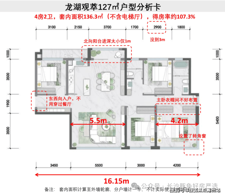 1. 所有户型中得房率最高的,赶上了现有新规产品的水准,总面宽16.15m,这个面积的算优秀了,但由于是塔楼只有南向3面宽;