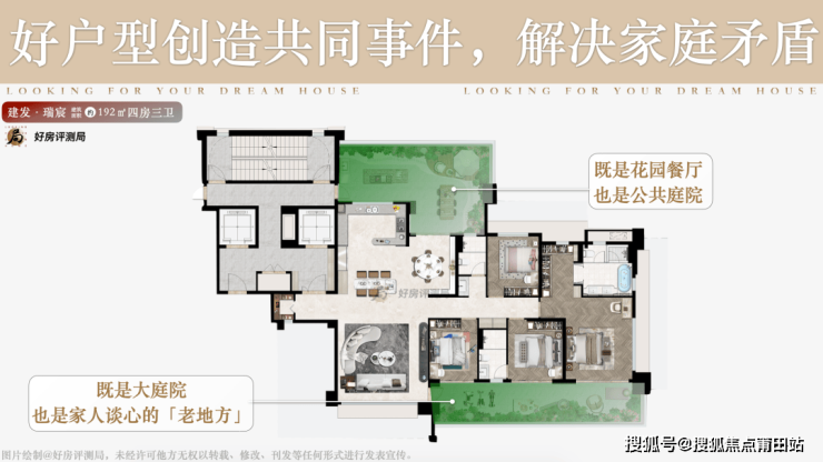 其次,庭院分配科学,创造无数个家人同框的场景,家庭稳固的基石就来自一次次的共同事件,好的开发商会用空间场景解决家庭矛盾。