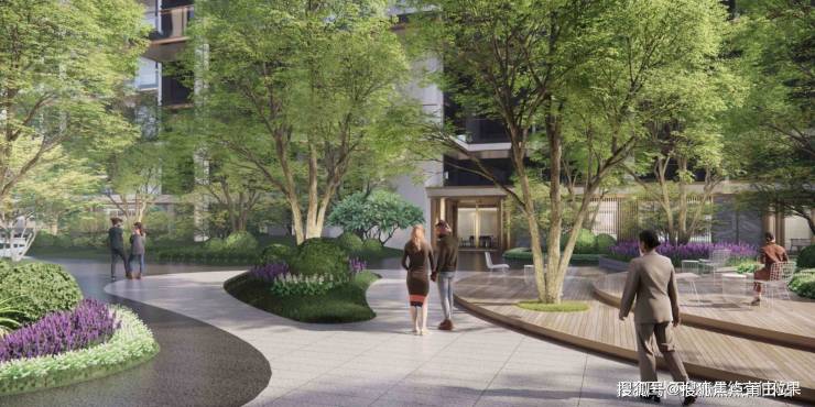 森居生活理念,融入园艺疗法设计景观,流动的疏林花岛,架空层与室外景观融合,让园林更显闲情逸趣。
