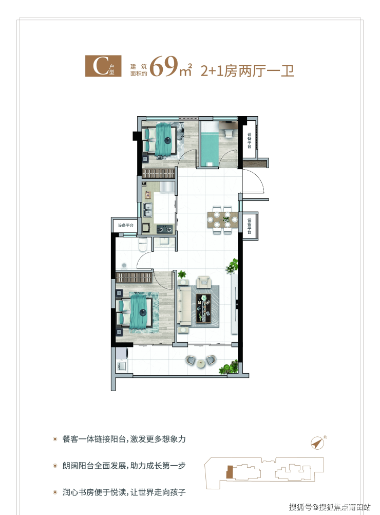 主力69-89㎡全明户型:双开间阳台设计,引入充沛采光;功能上实现2.5房至3.5房灵活布局,满足二胎家庭或三代同堂需求。