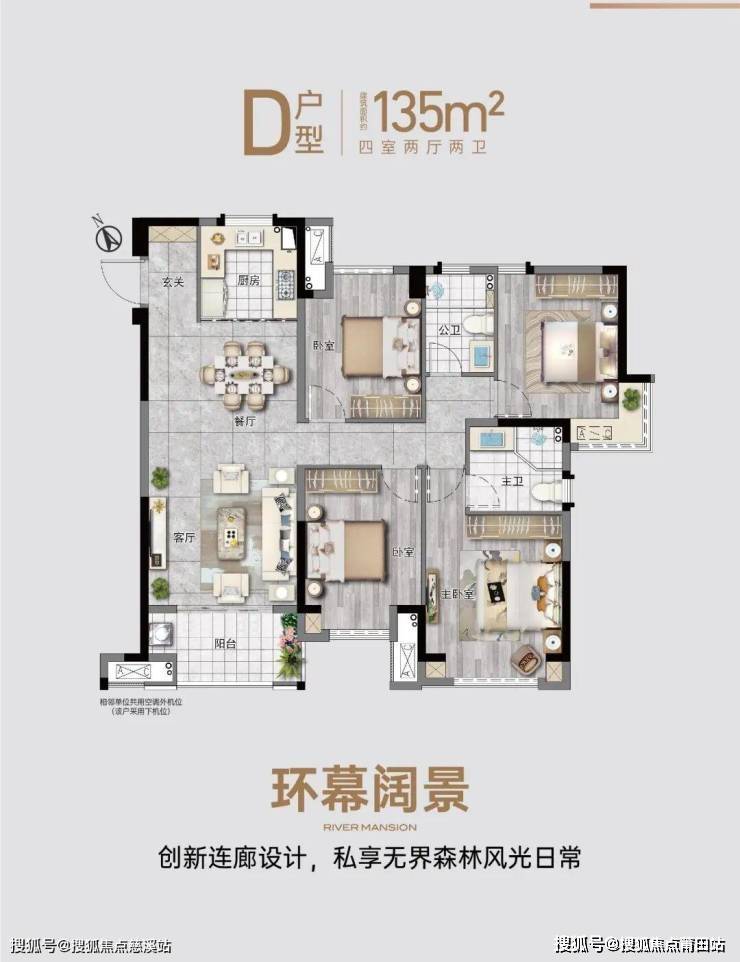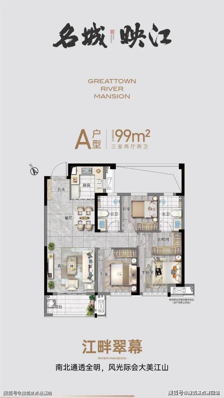主推户型建面约99-135平方米,3-4房,高层设计高度达3米,配置高品质中央空调、名牌厨电等,为居民提供舒适的居住环境。户型采光通风完美,南北通透设计和朝南主要生活空间布局,阳台景观开阔怡人。