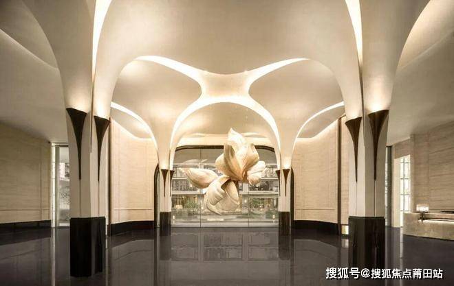 大堂入口雕塑以“白玉兰”为原型,以螺钿镶嵌、罩金、贴箔等工艺呈现,保留花朵廓形和银箔质感的同时,展现了优雅与宁静的意象美学。
