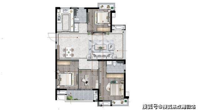 125平米:四房两厅两卫,位于端头,三开间朝南,横厅设计,客厅靠东侧采光,视野尚可,劣势在于动静不分离,同时125的主卧没有搭配衣帽间,功能略微简单,也存在没有独立玄关。