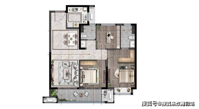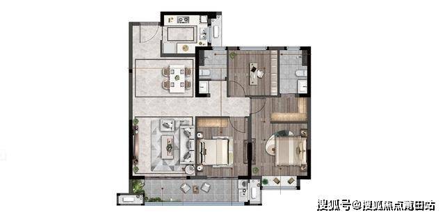 95平米:三房两厅两卫,位于中户,三开间朝南,市面主流布局,优势在于主卧搭配L型衣柜,同时搭配了宽阳台,劣势在于北面存在隐私问题,同时北面卧室较小。