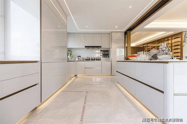 超大厨房,既满足中厨的煎炒烹饪,亦可实现西厨的优雅时光。经典白色厨柜,以铝合金勾勒利落线条,呈现拉丝铜的精致美感,呼应空间奢华调性。岛台拉手围合安装,让厨房的每个细节都充满质感。厨柜踢脚氛围灯,提升空间亮度,营造悬浮效果,将柔和、舒适的氛围一点点弥漫开来。