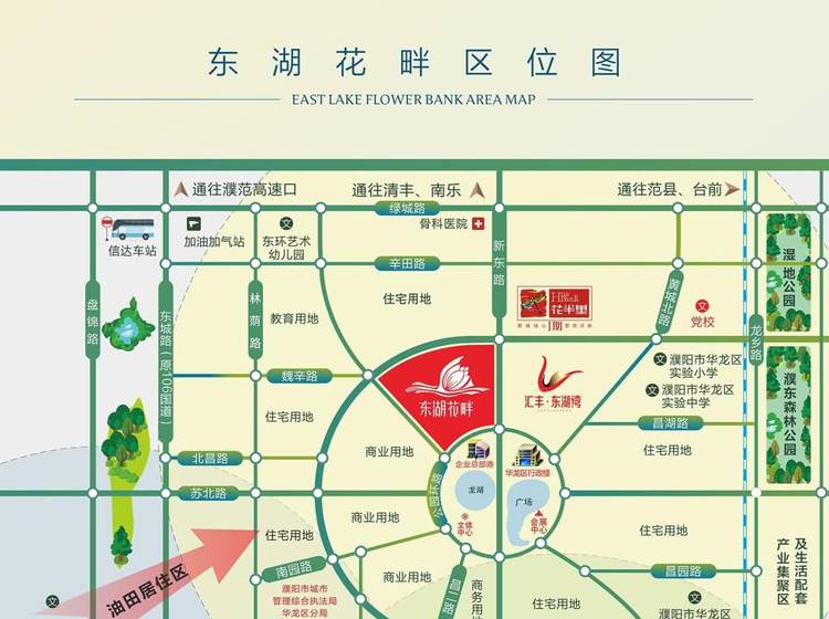 东湖花畔项目位于濮东新区新东路和公园环路交汇处,对望区政府,漫步即是一湖三公园,华龙区实验小学、实验中学一站式名校环伺周边。地处于濮东中心腹地,龙湖广场的北侧。漫步即是一湖三公园,行政中心、商务中心、文艺中心、商业中心四大中心等CBD千亿配套环伺周边,向东2.5公里即享高铁商圈,万千精华聚于一身!