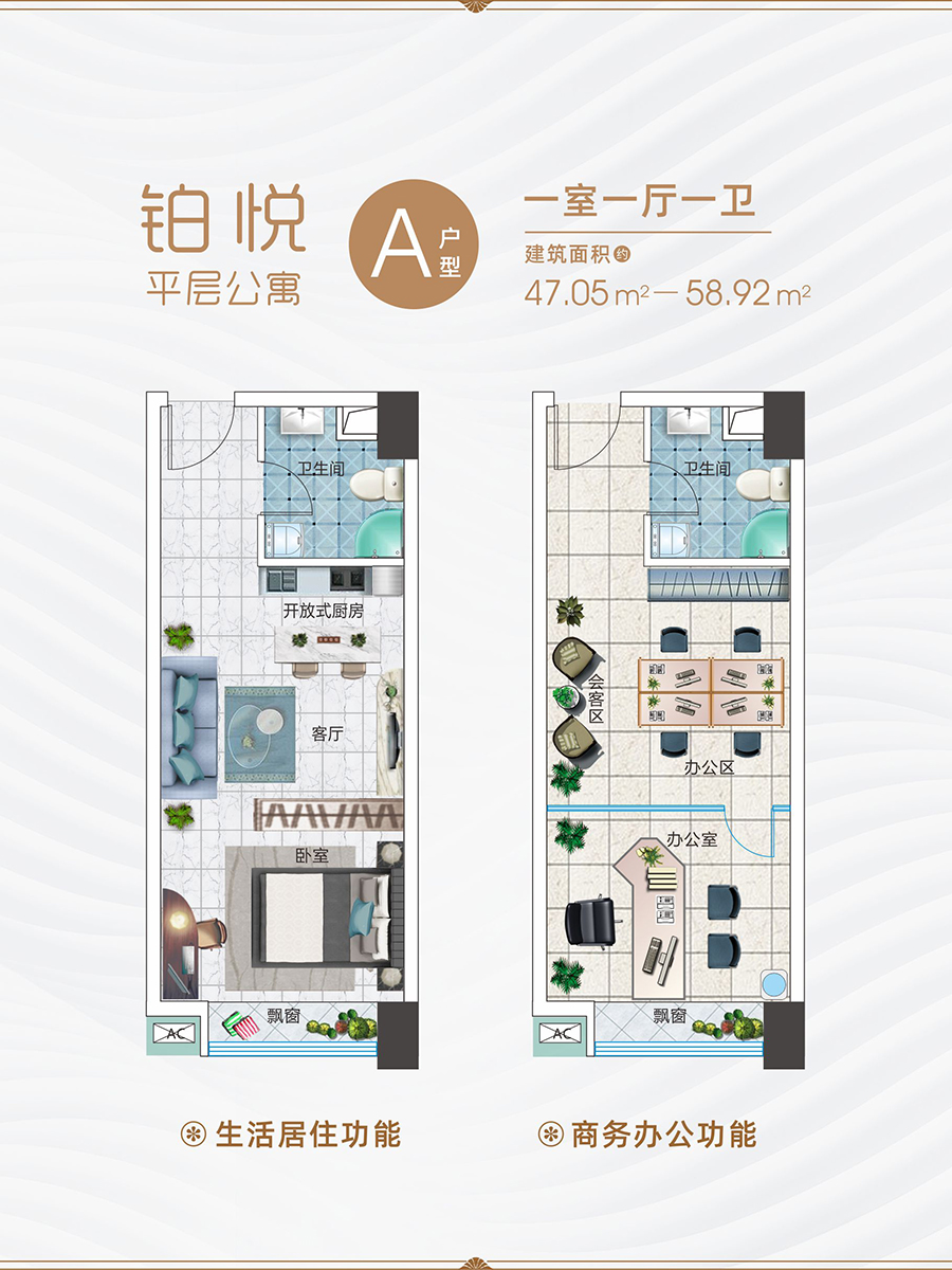 产品整体含盖有平层公寓、总裁湖景公馆,4.79m层高双层LOFT,独立卫生间,开放式厨房,49—130㎡百变空间,自住+投资+休闲+养老+出租+办公六位一体。小户型、低总价、门槛低、易出租、易转手、易升值,风险低、回报高,濮东新区投资新宠。