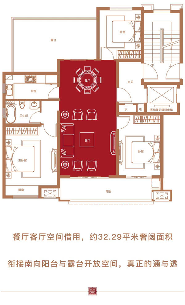 客厅作为家庭成员主要的活动区及会客区,只有宽敞通透的客厅,才不会令人感觉压抑。餐客一体的厅堂设计,真正的全明户型,客厅让生活主场与待客主场更加气派,彰显主人大家风范。此外,餐厅客厅贯通南向阳台与露台开放空间,做到了真正的“通”与“透”,阳光入户,清风过堂。
