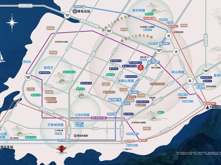 地铁3号线、地铁5号线(计划2028年通车)双地铁换乘,黑龙江路、重庆南路等城市主干道环伺,立体交通,畅达全城,高效连接市南、崂山、李沧。