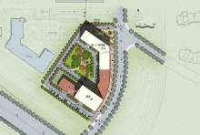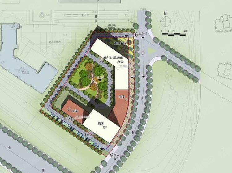 地块为商业地块,未来将建设酒店,商业和办公设施,具体为基地沿长沙路布置一栋15层酒店,沿宁乡路一侧布置一栋18层办公楼,同时在宁乡路交叉路口退让出一个街角广场,作为一个城市景观节点。