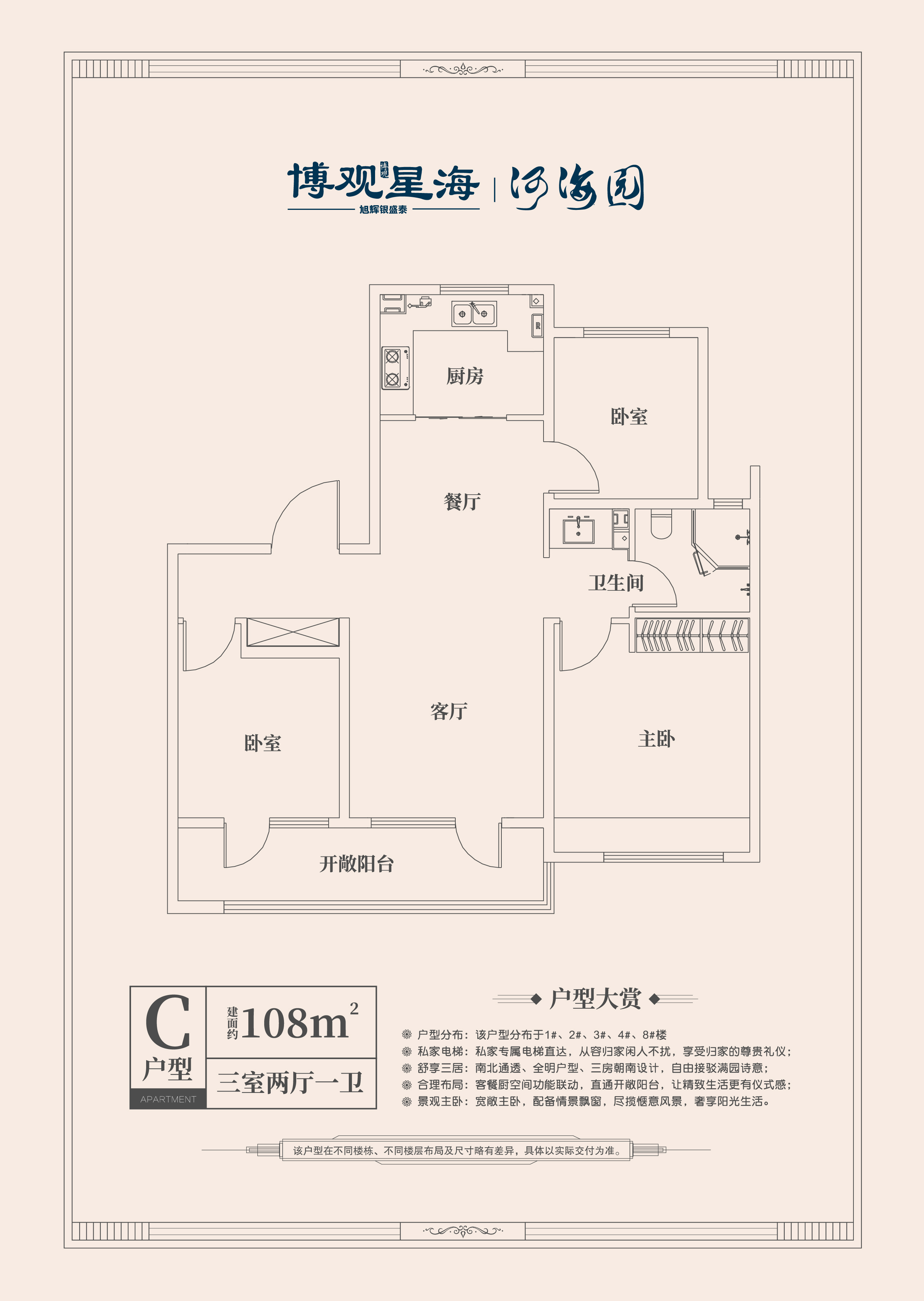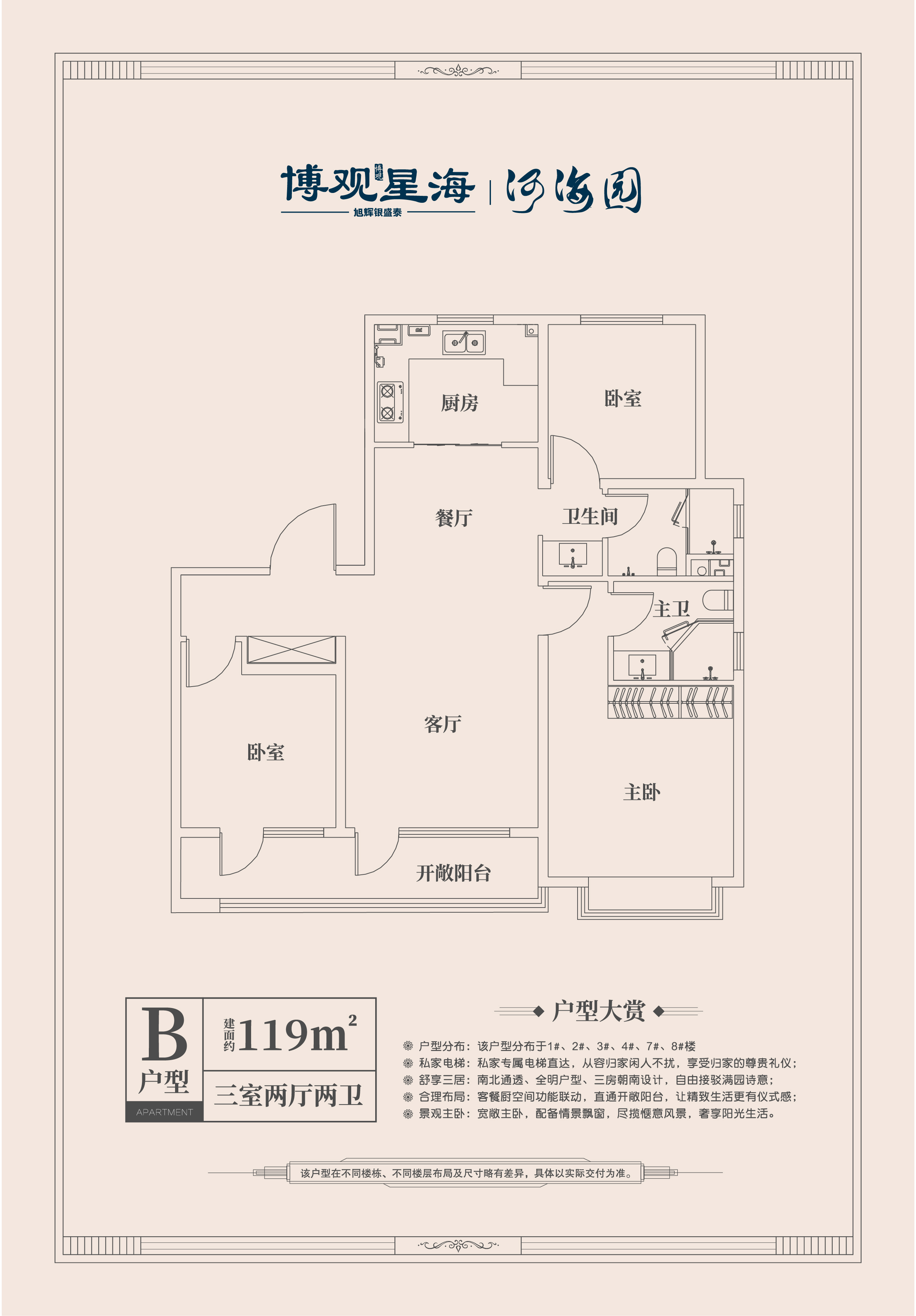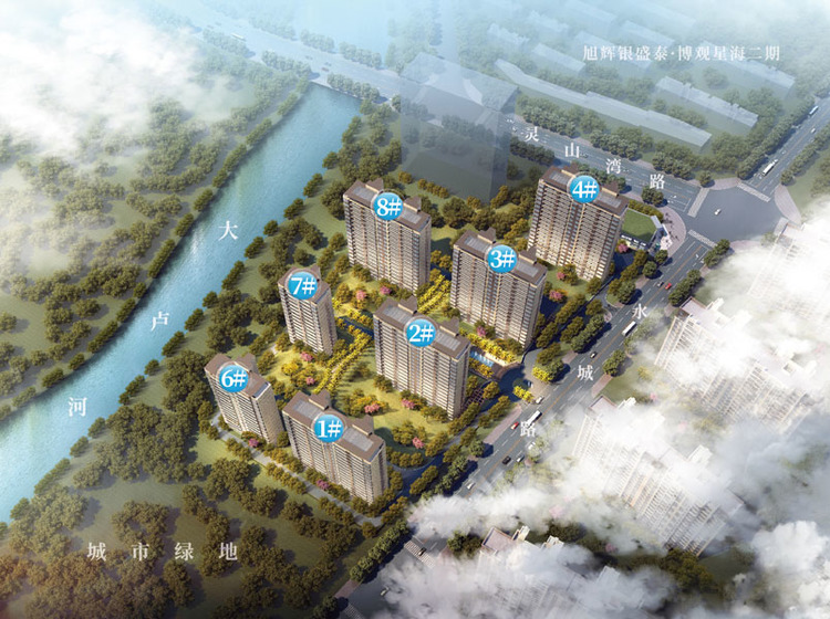 旭辉银盛泰·博观星海三期河海园,位于青岛西海岸新区灵山湾路以南、水城路以西。左侧为大卢河,河水潺潺,风景秀美;项目南侧为占地约29亩市政公园,绿荫环绕,景色宜人,向南远眺,就是灵山湾。项目坐拥无敌景观资源。总建筑面积6万㎡,规划7栋小高层一栋沿街商业,新亚洲主义简约建筑风格,“全龄景观”设计,满足各个年龄段的需求,低密亲氧高端社区。建面约108㎡、119㎡套三,143㎡套四。