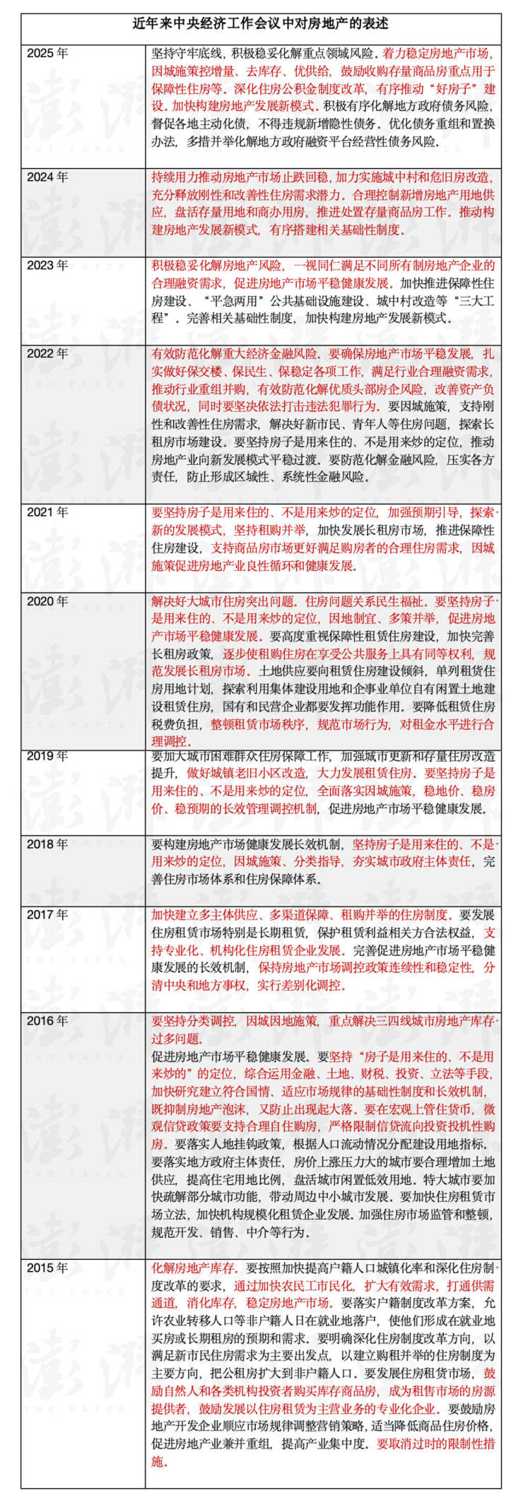 对于明年房地产市场的定调,会议提出“着力稳定房地产市场”。这是继2024年中央经济工作会议提出“持续用力推动房地产市场止跌回稳”后,中央经济工作会议再次强调“稳楼市”。