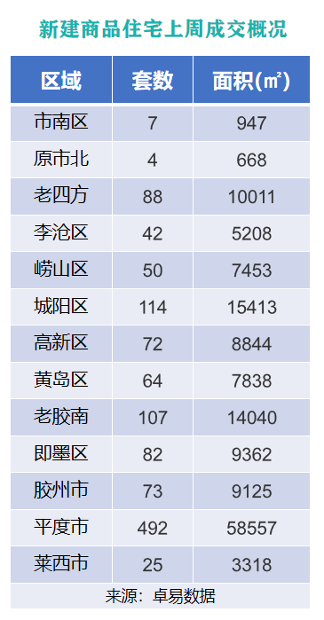 从各区成交情况来看,上周平度市新建商品住宅以成交面积58557㎡的成绩,位列上周各片区新建商品住宅成交面积榜首位;城阳区以成交面积15413㎡的成绩,位列成交面积榜第二位;原胶南市以成交面积14040㎡的成绩,位列成交面积榜第三位。