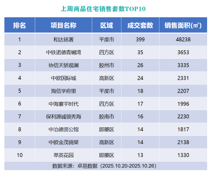 根据卓易数据统计,上周(10.20-10.26)青岛新建商品住宅成交1220套,成交面积为15.08万㎡。