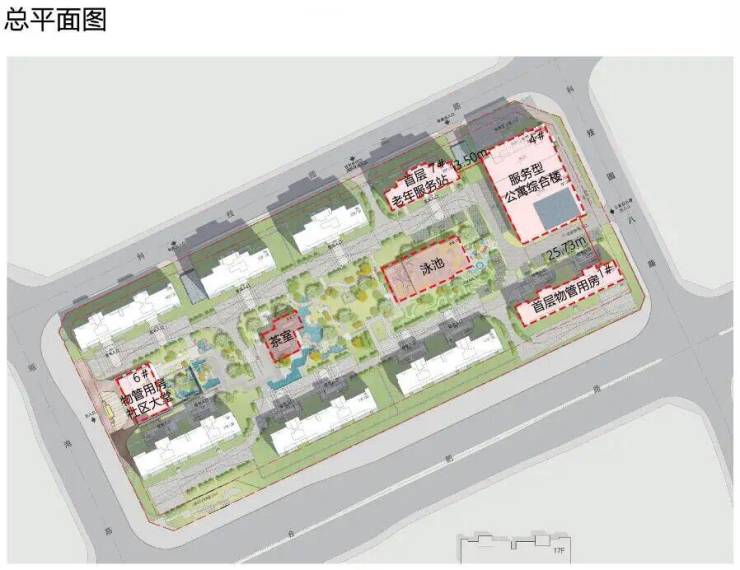 3.优化小区环境,细化住宅立面,按照幕墙施工图更新墙体四角表达,交通核竖向格栅调整为实体墙面。增设室内泳池、茶室、社区大堂等,计容面积增加约781.75㎡。老年服务站阳台进深由1.3-2m调整为2.1m,门廊调至套内,计容面积不变。细化4# 楼地下车库、设备用房等,局部增加储藏室夹层,商服配套车位减少29辆,7# 地下车库增加电信间一处。