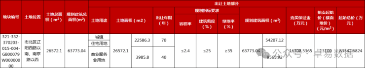 地块位于市北区南京路以西、辽阳西路以南,占地面积26572.1㎡,为商住混合用地(住宅建面≤85%),总建面63773.04㎡(住宅54207.12㎡,商业9565.92㎡),容积率≤2.4,建筑密度≤25%,绿地率≥35%,起拍楼板价13100元/㎡,起拍总价8.35亿,竞买保证金为1.67亿(比例20%)。