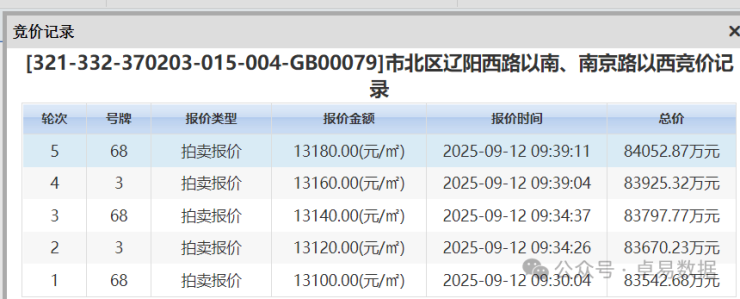 9月12日,市北CBD元鼎6.38万㎡商住地拍卖,有中海和招商2家报名参与,最先出价的是中海,招商跟上,最后经过5轮由青岛博莱置业有限公司(中海)摘得,成交地价13180元/㎡,总价8.41亿,溢价率0.61%。