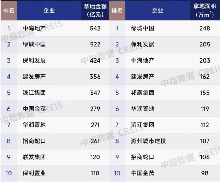 2025年1—7月房企权益拿地金额和面积TOP10 图片来源:中指研究院