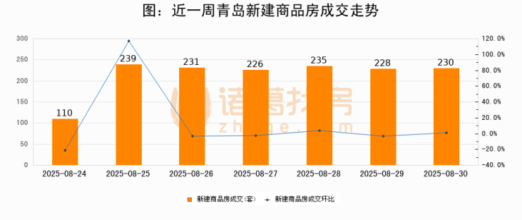根据青岛市住房和城乡建设局数据显示,2025年08月30日青岛新建商品房成交230套,较昨日增加2套,环比上涨0.9%。近一周青岛新建商品房日均成交215套。08月30日单日成交230套,高于近一周平均水平7%。