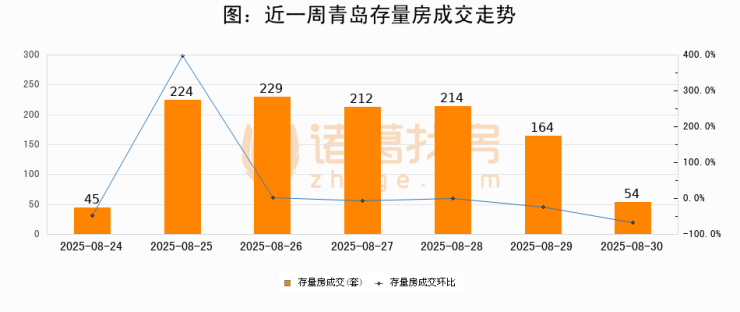 从存量房来看,2025年08月30日青岛存量房单日成交54套,比昨日减少110套,环比下降67.1%。从近一周存量房成交来看,青岛存量房日均成交套数为163套,08月30日单日成交54套,低于近一周平均水平66.9%。