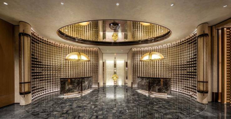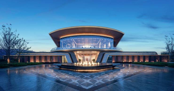 约80米风帆门界,以全玻璃幕墙折射云影天光,奢石镶嵌流畅线条,如巨轮舷边般精致,亦让人联想到悬浮海上的悉尼歌剧院。约3000㎡前场景观,山形起伏,遍植挺拔的北美娜塔栎林,叶色将随四季变换出斑斓色彩。加上宝格丽酒店式环岛瑰钻水景,在繁华天街与家之间,形成一道自然屏障,让归来者渐渐沉淀心绪,步入宁静。