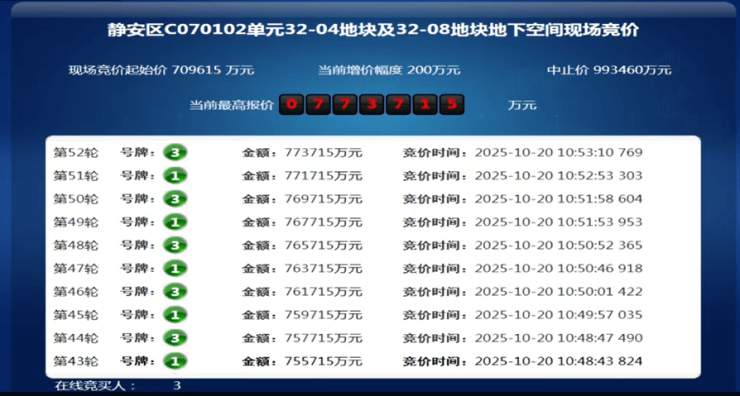 10月20日,上海第八批集中出让的地块进入现场竞价环节。其中,位于静安区苏河湾板块的C070102单元32-04地块及32-08地块地下空间吸引三位竞买人参与现场竞价,经过52轮竞价,未触及中止价以77.3715亿元的总价成交,溢价率9.03%,成交楼板价81415元/平方米。