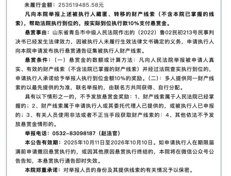 根据青岛中院的通告,该院作出的(2022)鲁02民初213号民事判决书已经发生法律效力,但因被执行人未履行生效法律文书确定的义务,未履行金额高达2.535亿元。