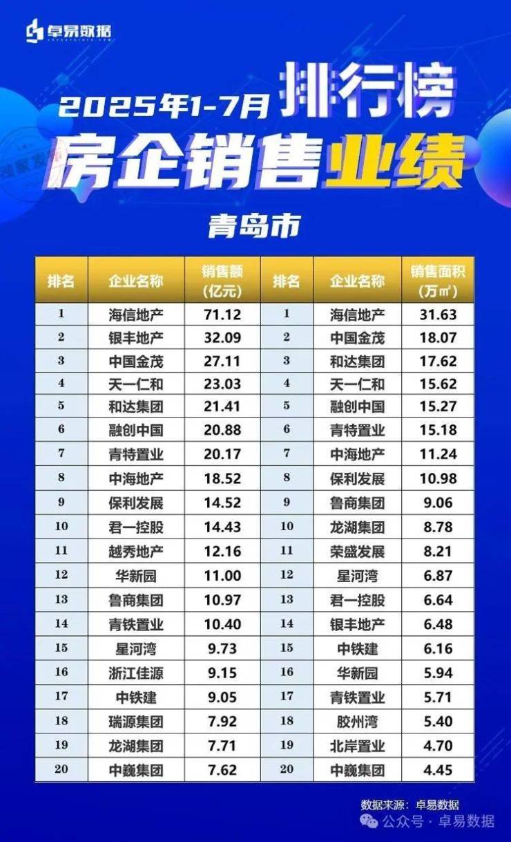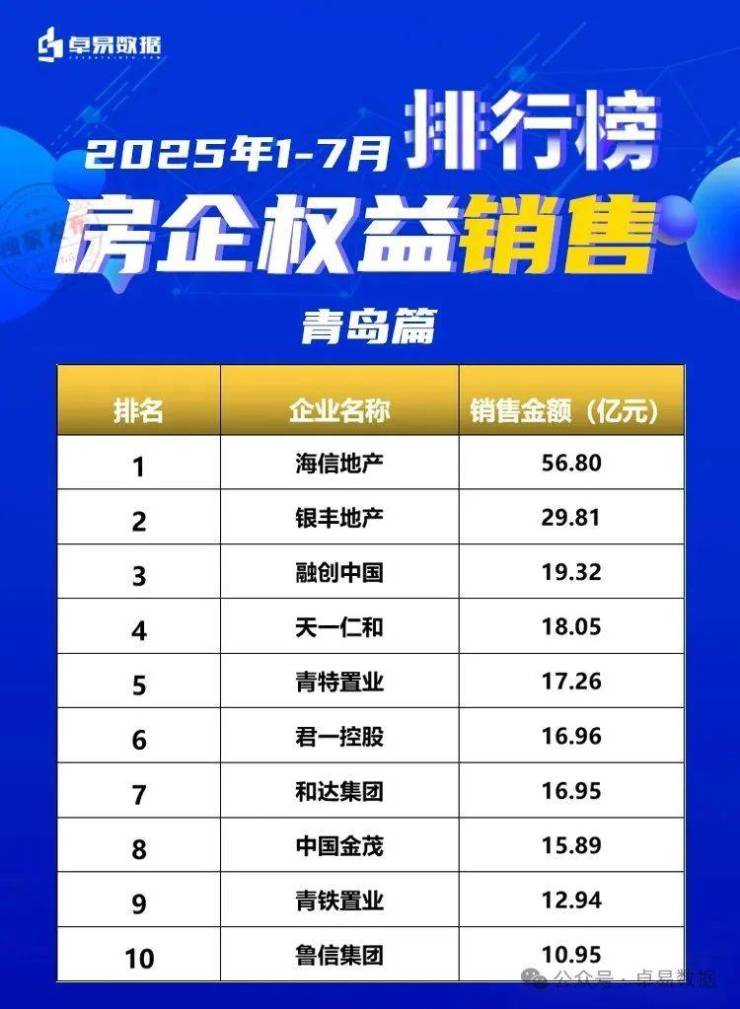 本榜单是根据卓易数据的独立研究,将青岛所有可售项目按照工商注册股权逐一进行权益拆分,剔除重复并表、重复计算的统计方法,展现一个客观的房企商品房销售权益“战绩”,更能清楚一家房企的实际业绩,更好的用于课题研究和监测。