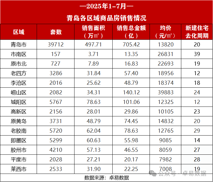 据卓易数据统计,青岛7月新房成交4558套,建面59.77万㎡,成交总金额86.69亿,套面金环比6月分别“暴跌”51.81%、48.20%、48.36%;套数同比去年微跌4.3%,面积和成交总金额同比去年上涨2.07%、5.17%。