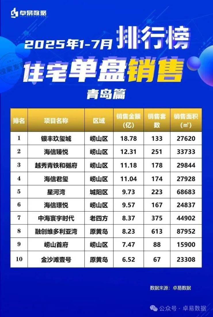 在新建住宅市场中,TOP10崂山项目占比60%,TOP4均位于崂山,改善需求绝对的主流。2025年前7个月第一的银丰玖玺城签约18.78亿;第二的海信臻悦12.31亿,第三的越秀青铁和樾府11.18亿。
