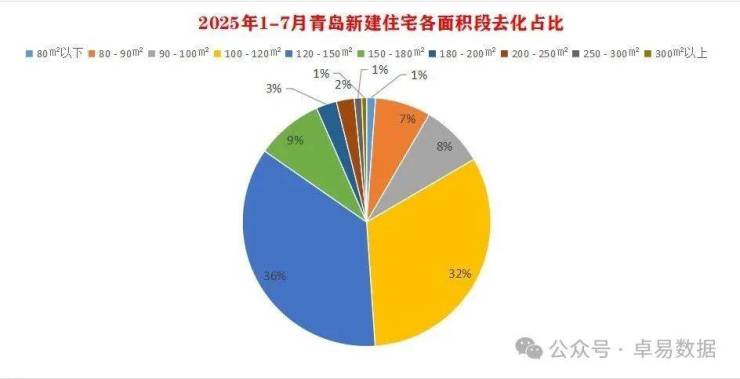 青岛的刚需端收缩,改善和置换需求增长,同时部分刚性需求被二手房和配售型保障房满足。2025年1-7的商品住宅去化中,面积成交结构中,100㎡以下的占比约17%,100-120㎡面积段成交最多占比36%,与120-150㎡两个面积段加起来约68%,青岛完全的改善市场。