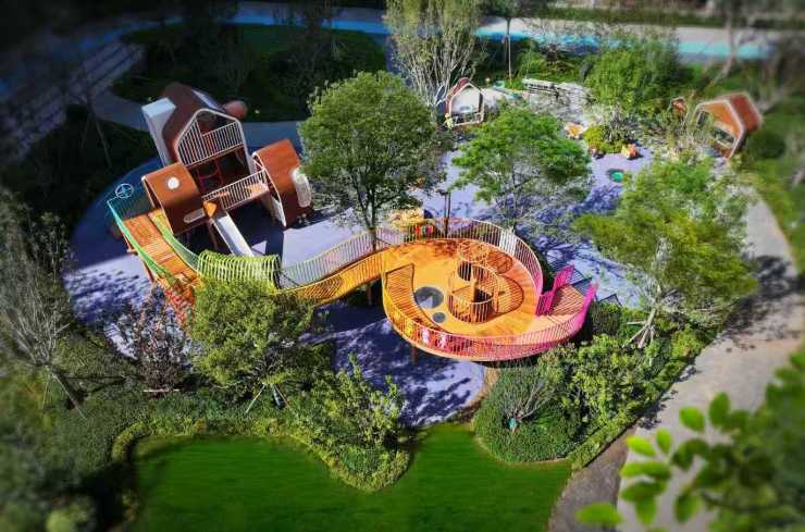 项目精研儿童全龄成长需求,不惜增加成本升级南区儿童游乐区。一是增设高达3层的树屋滑梯、充满奇幻感的时空长廊跑道等一体化大型主器械,放置音乐玩具、植物昆虫科普墙等互动器械,增加蹦床等丰富儿童区趣味设施。二是增加空间功能细节,增设直饮水取水点,满足孩童玩乐后的健康补水需求;增设三处监控,规划休息区、婴儿车停放区,配置手机充电口、wifi覆盖等功能,满足家长的看护需求。